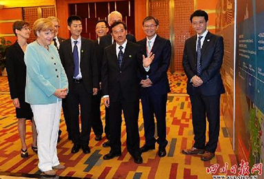 7月6日上午9时许,德国总理默克尔在成都出席“中国(四川)-德国新型城镇化合作论坛”开幕式并致辞。出席论坛开幕式前,她参观了成都市新筑路桥公司情况介绍展板。
