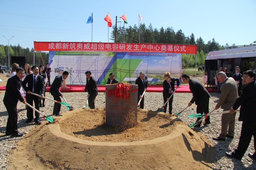 (图为白俄罗斯经济部副部长雅罗申科、明斯克市副市长让娜女士、四川省发改委主任唐利民、中国驻白俄罗斯使馆经商参处参赞刘雪松、招商局董事、中白合资公司CEO胡政、中白合资公司总经理李海欣、成都新筑公司副总裁杜晓峰、明斯克市政机车厂总经理卡尔等为成都新筑奥威超级电容研发生产中心进行奠基培土。)