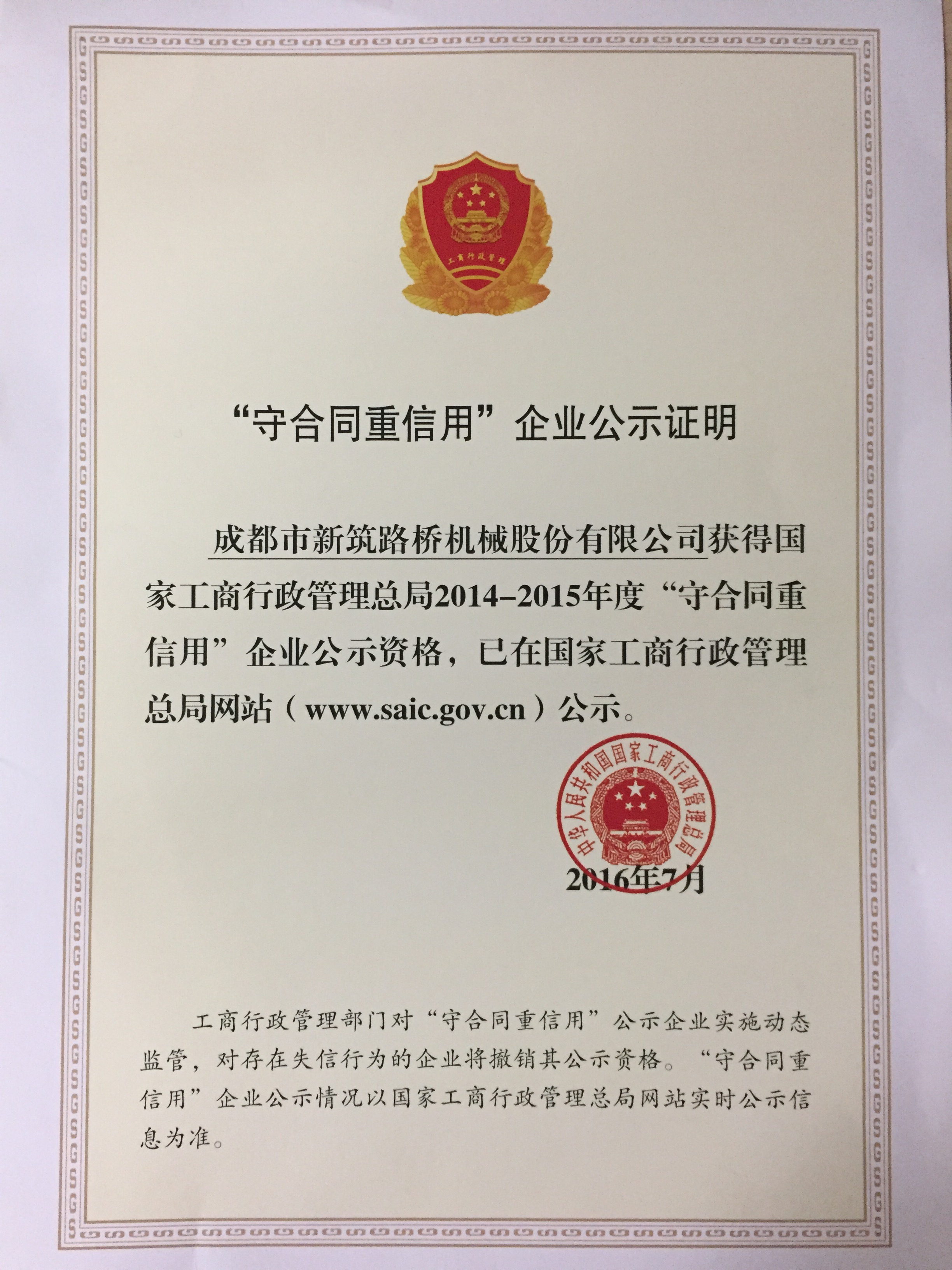 近日成都市新筑路桥机械股份公司收到国家工商行政管理总局颁发的2014-2015年度“守合同重信用”企业公示证书。经过国家工商行政管理总局的严格评定,新筑股份公司获得国家级“守合同重信用”企业荣誉称号。这是公司继获得省级“守合同重信用”企业称号后,获得的更高级别的荣誉。