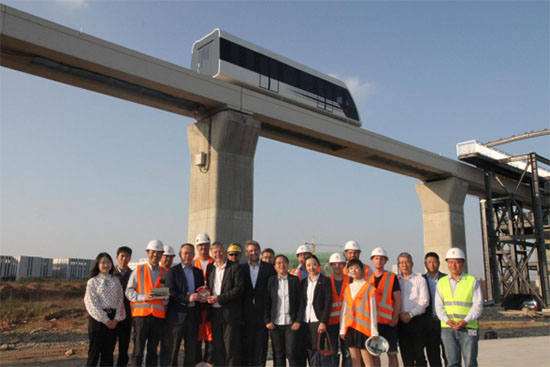 卡尔·弗雷勒先生一行登上了新筑股份中低速磁浮试验登车平台,参观了磁浮工程样车运行,听取了项目情况介绍。