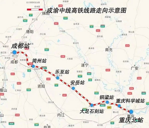 新建成渝中线铁路(含十陵南站)重庆段正线全长102.698公里,设计时速350km/h。成渝中线铁路北接渝万高铁、郑渝高铁,是国家“八纵八横”高铁网中沿江通道的重要组成部分。作为成渝地区双城经济圈建设的引领性、标志性、示范性工程,成渝中线铁路对构建川渝一体化综合交通运输体系,强化成渝双核引领、区域联动,共建“一带一路”和长江经济带发展,推进新时代西部大开发形成新格局具有重要的支撑作用。